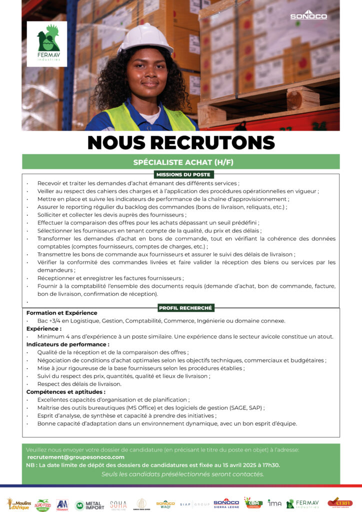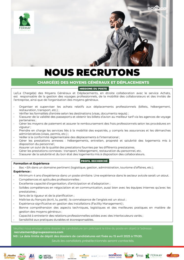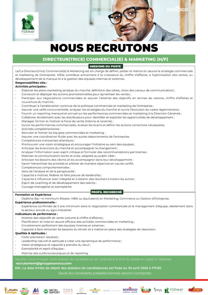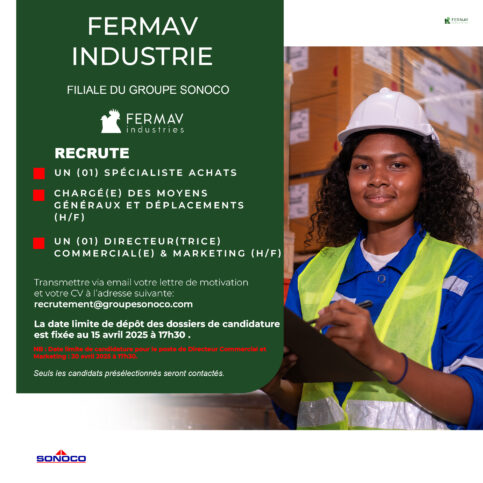 Un (e) 01 Directeur(trice) Commercial(e) & Marketing (H/F); Un(e) 01 Chargé(e) des Moyens Généraux et Déplacements; Un Spécialiste Achat (H/F);