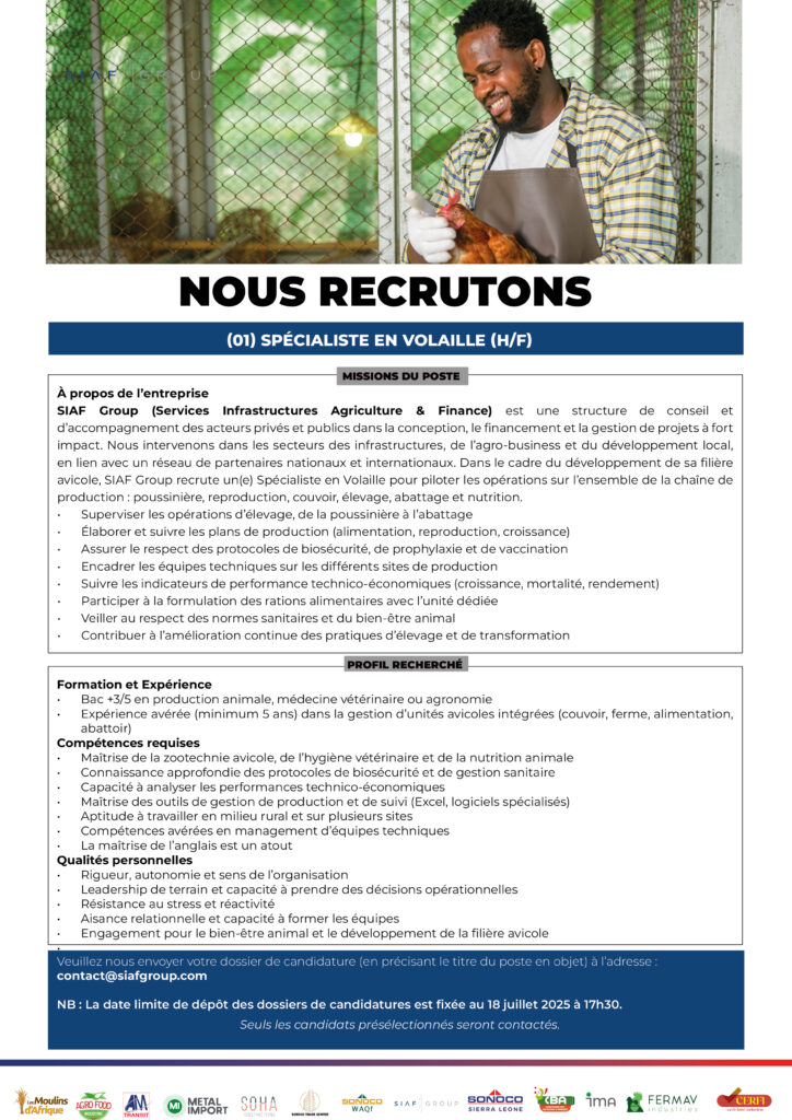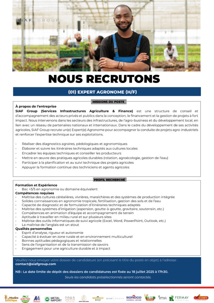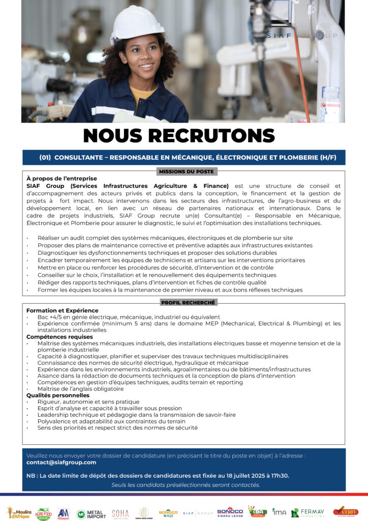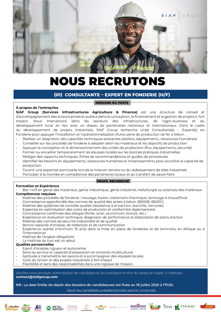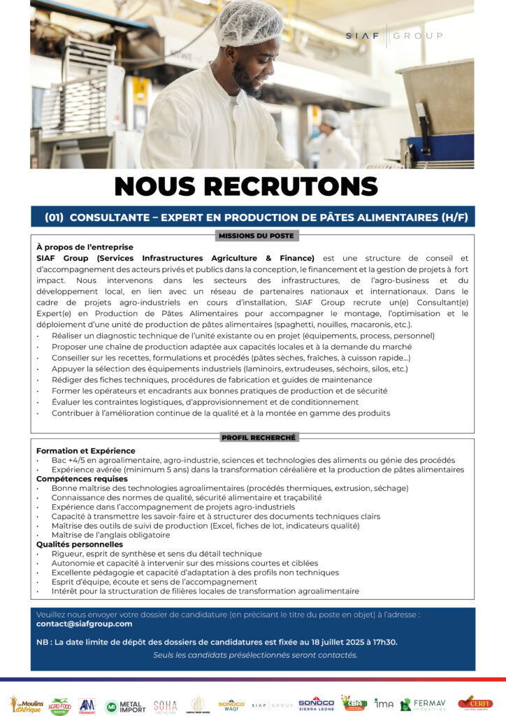 (01) Corporate Finance Manager (h/f); (01) Consultante – Responsable en Mécanique, Électronique et Plomberie (h/f); (01) Consultante – Expert en Fonderie (H/F); (01) Consultante – Expert en Production de Pâtes Alimentaires (H/F); (01) Expert Agronome (H/F) (01) Spécialiste en Volaille (H/F)